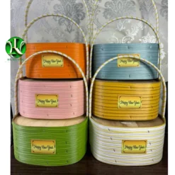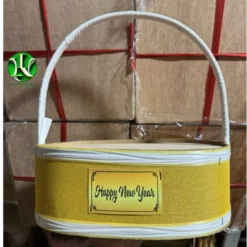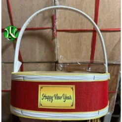 Giỏ quà tết đế cao 15cm, quấn dây nhựa nhiều màu gắn thẻ Happy New Year màu vàng, giỏ trái cây, set yến.